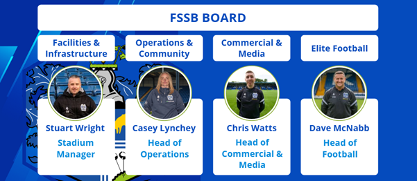 - Operations & Community – matchdays, volunteers, supporter engagement and community links